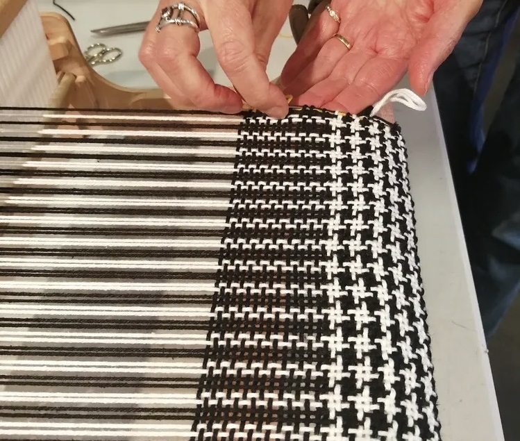 Tissage sur métiers à tisser de table à peigne envergeur, en fils de coton et laine.